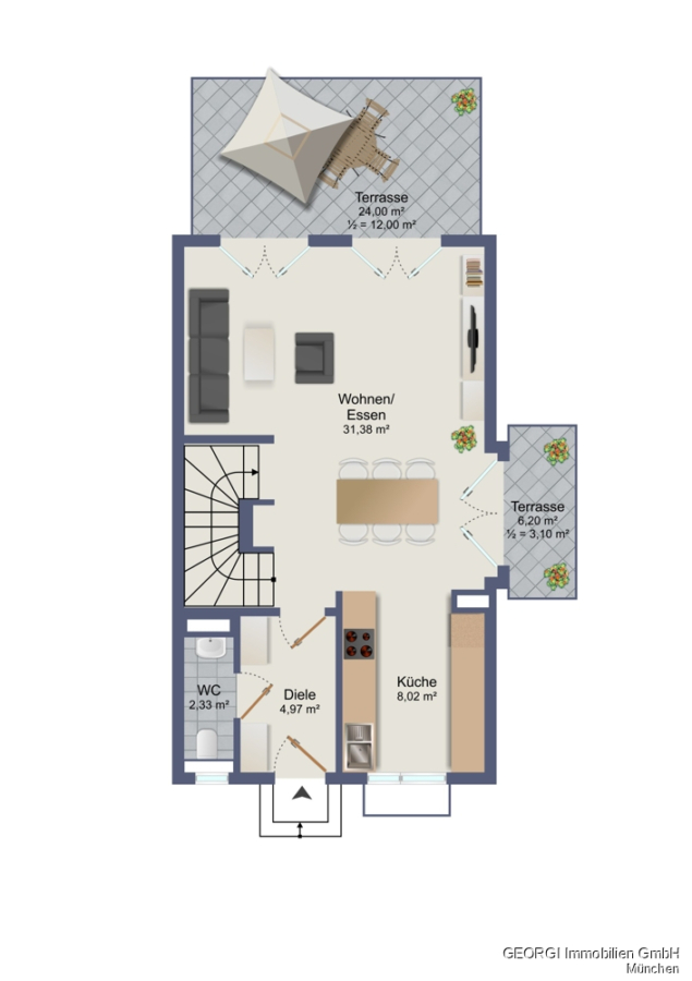 Modernes Reiheneckhaus im Erbbaurecht mit zwei Terrassen und sonniger Galerie